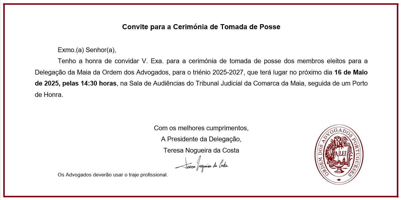 Vimos pelo presente relembrar V. Exa a data da Cerimónia de Tomada de Posse da nossa Delegação, que se realizará na próxima sexta-feira dia 16 de Maio pelas 14:30horas na Sala de Audiências do Tribunal Judicial da Maia, e salientar a importância da vossa presença. Aproveitamos a oportunidade para informar que marcarão presença o Exmo. Senhor Bastonário da Ordem dos Advogados, Dr. João Massano e o Exmo. Senhor Presidente do Conselho Regional do Porto reeleito, Dr. Jorge Barros Mendes.