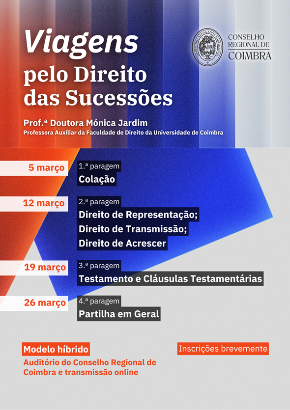 Com sessões semanais de uma hora e meia, a formação, a cargo da Professora Doutora Mónica Jardim, Professora Auxiliar da FDUC, incluiu os temas da Colação (5 de março), Direito de representação, Direito de transmissão e Direito de acrescer (12 de março), Testamento e Cláusulas testamentárias (19 de março) e Partilha em geral (26 de março).