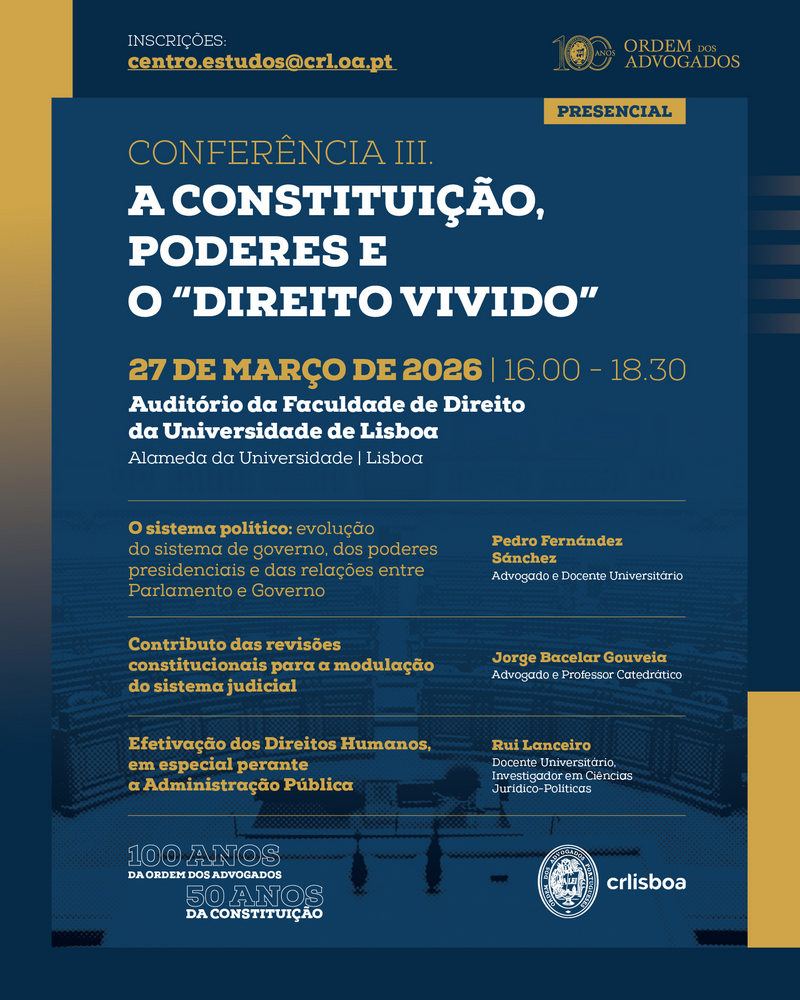 No âmbito das Comemorações dos 50 Anos da Constituição da República Portuguesa e dos 100 Anos da Ordem dos Advogados, 0 CRLisboa promove, na próxima sexta-feira, mais uma conferência do Ciclo, dedicada ao tema A Constituição, poderes e o “direito vivido” , no Auditório da Faculdade de Direito da Universidade de Lisboa, Alameda da Universidade, em Lisboa, que conta com a presença do Presidente do Conselho Regional de Lisboa da Ordem dos Advogados, Telmo Guerreiro Semião e do vogal do Conselho Regional de Lisboa, João Henriques Pinheiro, como moderador.