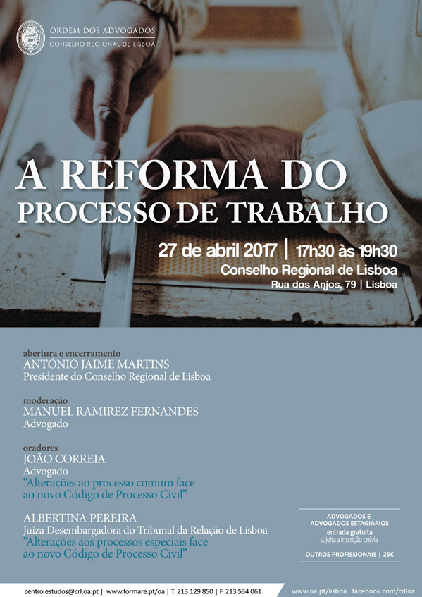O Conselho Regional de Lisboa convida o Colega Dr. João Correia e a Juíza Desembargadora Dra. Albertina Pereira para um debate sobre a Reforma do Processo de Trabalho, moderado pelo Dr. Manuel Ramirez Fernandes. Entrada Gratuita para Advogados e Advogados Estagiários mediante inscrição prévia. Taxa de inscrição para Outros Profissionais: 25€ Inscrições: centro.estudos@crl.oa.pt | www.formare.pt/oa