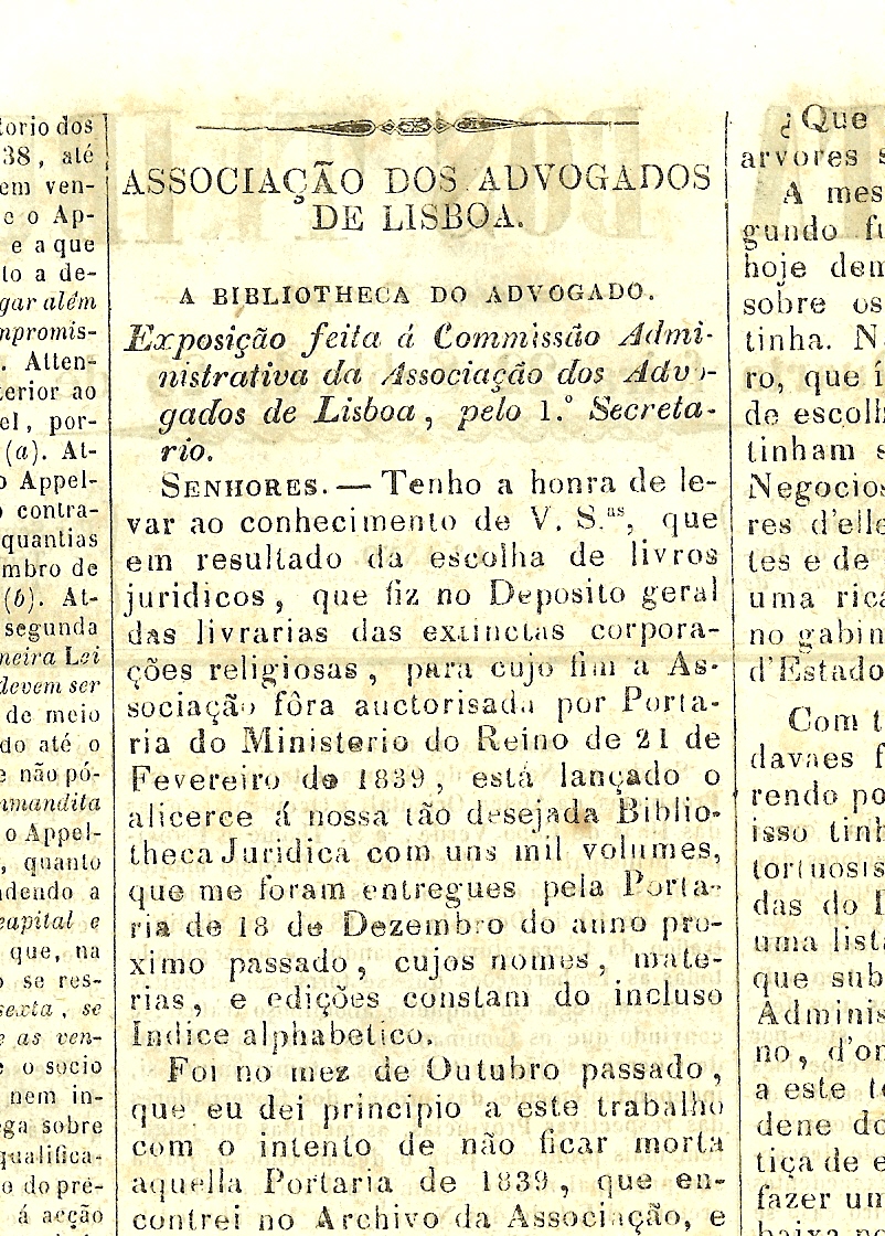 Por Portaria de 21 de Fevereiro de 1839, do Ministério do Reino, fora permitido à Associação dos Advogados de Lisboa proceder à selecção de obras jurídicas no Depósito Geral das Livrarias das Extintas Corporações Religiosas.