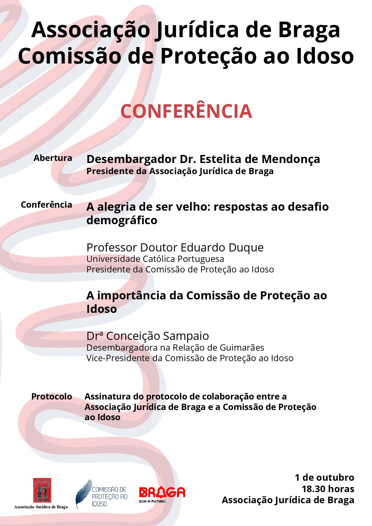 A Associação Jurídica de Braga e a Comissão de Proteção ao Idoso vão realizar, no próximo dia 1 de Outubro, pelas 18h30, uma conferência subordinada ao tema "A alegria de ser velho: respostas ao desafio demográfico e a importância da Comissão de Proteção ao Idoso".