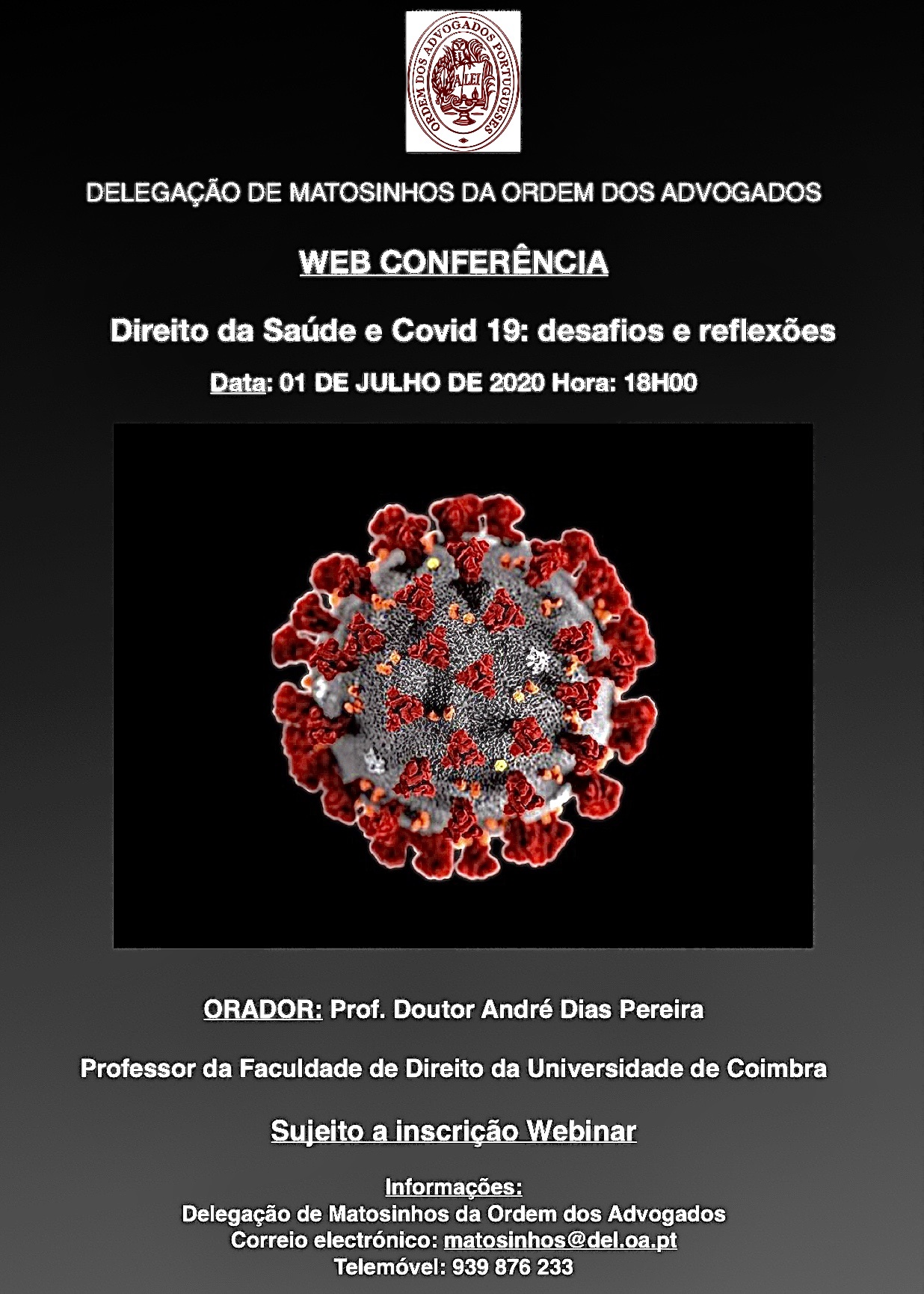 A Delegação de Matosinhos da Ordem dos Advogados vai realizar, no próximo dia 1 de Julho, pelas 18h00, uma Web Conferência subordinada ao tema “Direito da Saúde e Covid-19: desafios e reflexões”, em que será orador André Dias Pereira, Professor da FDUC, sendo moderadora Olímpia Costa, Vogal da Delegação de Matosinhos da Ordem dos Advogados.